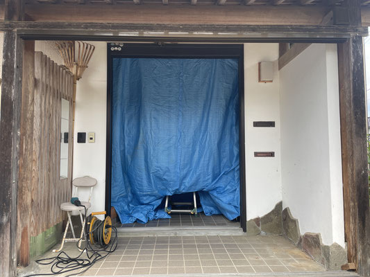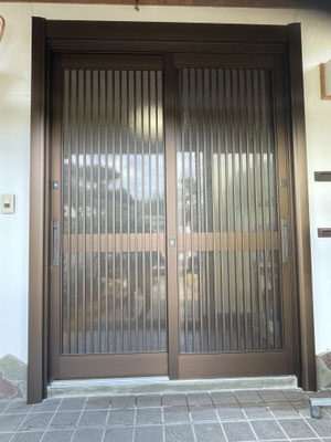 玄関引戸入替です。既存の引戸を撤去し新しい枠を付けていきます。